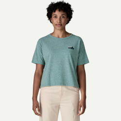 The '73 Skyline graphic is inspired by the logo that was sewn on Patagonia models at the time. This pattern is screen-printed on our Women's '73 Skyline Easy-Cut Responsibili-Tee®, a classic crewneck tee with a loose, relaxed fit, slightly elongated sleeves and a straight hem. T-shirt made from fabric scraps and recycled bottles, reducing our reliance on virgin raw materials. Model made in a Fair Trade Certified™ workshop.