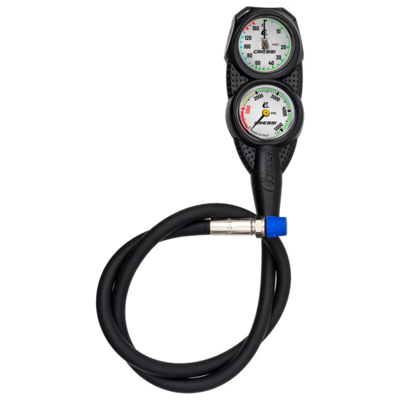 The MiniConsole PD2 is a small scuba diving console that houses the Analog Pressure Gauge and the Analog Depth Gauge. Both gauges are high-quality instruments with chrome-plated brass cases, and the depth gauge has a diaphragm membrane actuated function. Both gauges have large, circular, easy-to-read scales. The instruments are housed in a small, modern-shaped console boot, made from Polycarbonate and Desmopan (a Thermoplastic Polyurethane), two materials that guarantee protection from shocks and scratches, and which, at the same time, are very light. At the end of the console, slightly to the sides, there are two eyelets for fastening the instrument to the BCD or harness with a clip or lanyard so that it does not hang down with the risk of catching and damaging the environment or the instruments. The luminescent face of the 70 m | 230 ft Depth Gauge, the first 40' of Depth Readings are in 10' increments (which correspond to the area of decompression stops), and are widely spaced for ease-of-reading. For at-a-glance monitoring of depth, the face is divided into 3 different colored zones: green up to 66', light-blue from 66' to 130', and red from 130' to the end of the scale. The instrument has a maximum depth indicator that stops at the maximum depth reached during the dive. This function is convenient for logging dive information. The Analog Gauge luminescent dial reads from 0 to 5000 PSI (350 BAR). The face is divided into three different colored zones: for at-a-glance monitoring of air, the area from 600 PSI (40 BAR) and below is highlighted in red with a solid bar and red stripes. If the gauge is used on deeper dives, the red scale extends and fades to 1,300 PSI (100 BAR), providing added-reserve-air indication required at greater depths. From 600 to approximately 3,000 PSI is green, and from 3,000 PSI (200 BAR) to the end of the scale is blue. The front glass lens is made to act as a pressure relief valve. In the event of a sudden increase in pressure, the glass rises slightly, allowing the excess pressure to escape. The PD2 is equipped with a 7/16" threaded high-pressure hose.