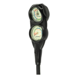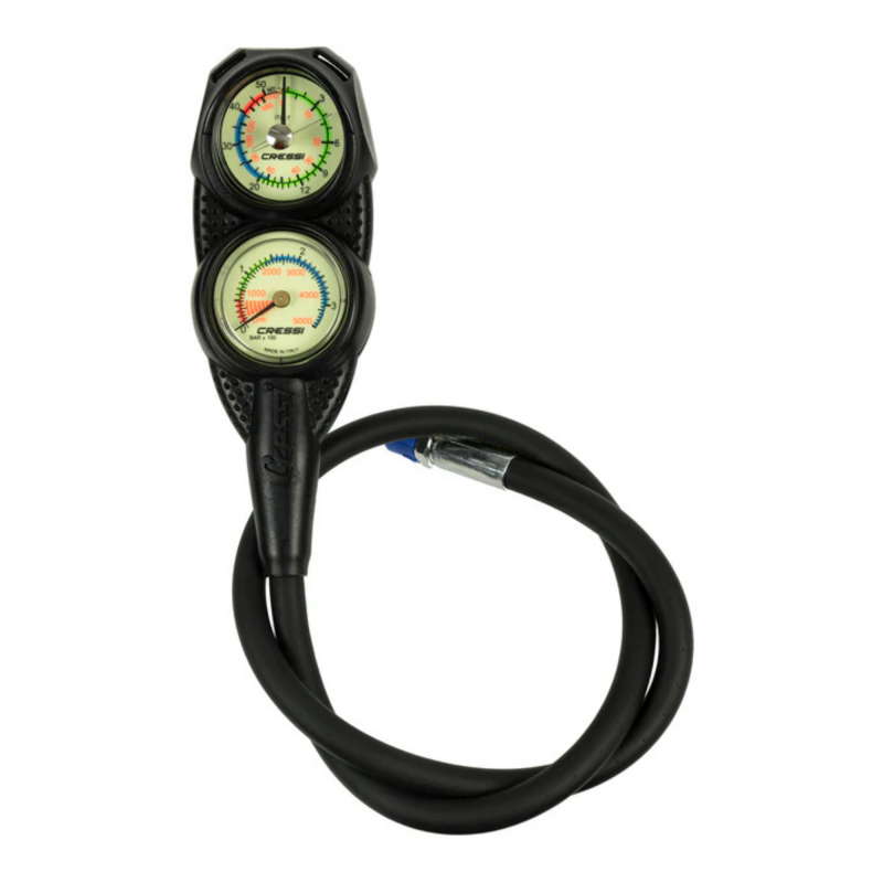 La Cressi MiniConsole 2 est une petite console de plongée sous-marine qui abrite le manomètre Mini-Manomètre et le jauge de profondeur analogique. Les deux jauges sont des instruments de haute qualité avec des étuis en laiton chromé et la jauge de profondeur a une fonction actionnée par membrane du diaphragme. Les deux jauges possèdent de grandes échelles circulaires faciles à lire. Les instruments sont logés dans un petit coffre de console de forme moderne, fabriqué en polycarbonate et Desmopan (un polyuréthane thermoplastique), deux matériaux qui garantissent la protection contre les chocs, les rayures et qui, en même temps, sont très légers. À l'extrémité de la console, légèrement sur les côtés, il y a deux œillets pour fixer l'instrument au BCD ou au harnais avec une pince ou un cordon afin qu'il ne pende, au risque d'attraper et d'endommager l'environnement ou les instruments. La face luminescente de la jauge de profondeur de 230 pieds, les premiers 40 pieds des lectures de profondeur sont en incréments de 10 pieds (qui correspondent à la zone des arrêts de décompression), et sont largement espacés pour faciliter la lecture. Pour un suivi rapide de la profondeur, le visage est divisé en 3 zones colorées différentes : vert jusqu'à 66', bleu clair de 66' à 130' et rouge de 130' jusqu'à la fin de l'échelle. L'instrument possède un indicateur de profondeur maximale qui s'arrête à la profondeur maximale atteinte pendant la plongée. Cette fonction est extrêmement pratique pour enregistrer les informations de plongée. Le cadran luminescent du manomètre Mini-Manomètre indique de 0 à 5000 PSI (350 BAR). Le visage est divisé en trois zones colorées différentes : pour une surveillance rapide de l'air, la zone de 600 PSI (40 BAR) et en dessous est surbrillée en rouge avec un BAR uni et des bandes rouges. Si le jauge est utilisé lors de plongées plus profondes, l'échelle rouge s'étend et s'estompe jusqu'à 1 300 PSI (100 BAR), ce qui permet une indication de réserve d'air ajoutée nécessaire à de plus grandes profondeurs. De 600 à environ 3 000 PSI est vert et de 3 000 PSI (200 BAR) jusqu'à la fin de l'échelle est bleu. La lentille vitrée avant est conçue pour servir de soupape de décharge de pression. En cas d'augmentation soudaine de la pression, le verre monte légèrement, permettant à l'excès de pression de s'échapper. La Mini-Console 2 est équipée d'un tuyau haute pression fileté de 7/16".