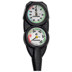 La MiniConsole PD2 est une petite console de plongée qui abrite le manomètre analogique et le jauge de profondeur analogique. Les deux jauges sont des instruments de haute qualité avec des étuis en laiton chromés, et la jauge de profondeur a une fonction actionnée par membrane de membrane. Les deux jauges ont de grandes échelles circulaires faciles à lire. Les instruments sont logés dans un petit coffre de console de forme moderne, fabriqué en polycarbonate et Desmopan (un polyuréthane thermoplastique), deux matériaux qui garantissent une protection contre les chocs et les rayures, et qui, en même temps, sont très légers. À l'extrémité de la console, légèrement sur les côtés, il y a deux œillets pour fixer l'instrument au BCD ou au harnais avec une pince ou un cordon afin qu'il ne pende, au risque d'attraper et d'endommager l'environnement ou les instruments. La face luminescente du 70 m | Jauge de profondeur de 230 pieds, les premiers 40 pieds de lectures de profondeur sont par incréments de 10' (correspondant à la zone des butées de décompression), et sont largement espacées pour faciliter la lecture. Pour une surveillance rapide de la profondeur, le visage est divisé en 3 zones colorées différentes : vert jusqu'à 66', bleu clair de 66' à 130', et rouge de 130' jusqu'à la fin de l'échelle. L'instrument possède un indicateur de profondeur maximale qui s'arrête à la profondeur maximale atteinte pendant la plongée. Cette fonction est pratique pour enregistrer les informations de plongée. Le cadran luminescent de l'Analog Gauge indique de 0 à 5000 PSI (350 BAR). Le visage est divisé en trois zones colorées différentes : pour une surveillance rapide de l'air, la zone de 600 PSI (40 BAR) et en dessous est mise en évidence en rouge avec une barre solide et des bandes rouges. Si la jauge est utilisée pour des plongées plus profondes, l'échelle rouge s'étend et s'estompe jusqu'à 1 300 PSI (100 BAR), fournissant une indication d'air de réserve supplémentaire nécessaire à des profondeurs plus élevées. De 600 à environ 3 000 PSI est vert, et de 3 000 PSI (200 BAR) jusqu'à la fin de l'échelle est bleu. La lentille vitrée avant est conçue pour servir de soupape de décharge de pression. En cas d'augmentation soudaine de la pression, le verre monte légèrement, permettant à l'excès de pression de s'échapper. Le PD2 est équipé d'un tuyau à haute pression fileté de 7/16".